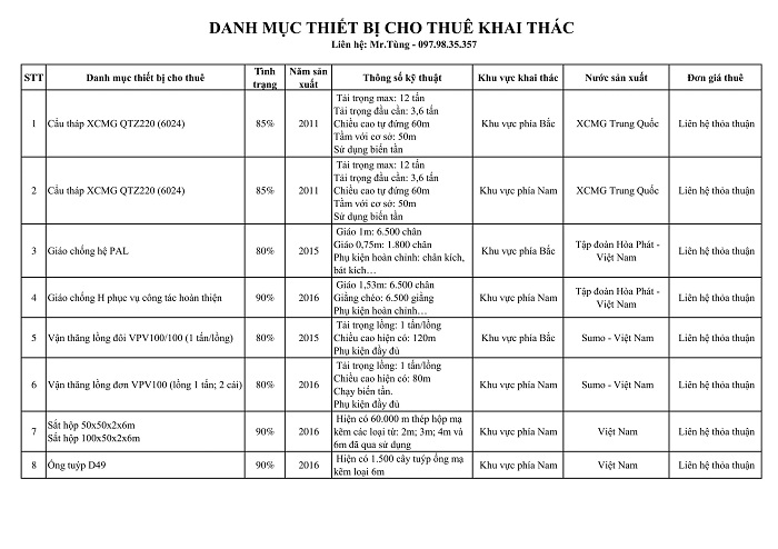 Hiện nay Công ty đang có một số thiết bị phục vụ thi công xây lắp, quý khách có nhu cầu thuê xin liên hệ với chúng tôi.