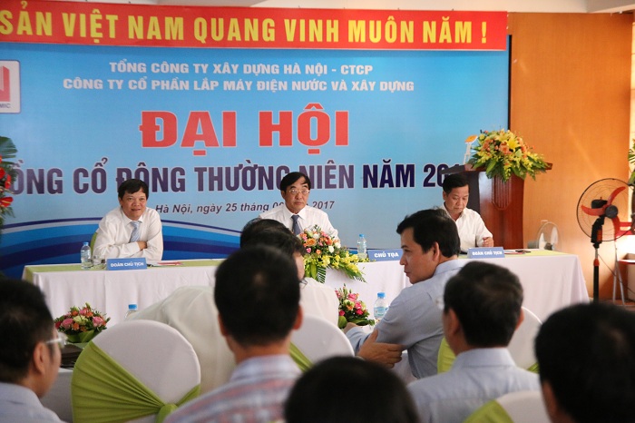 Ngày 25/6/2017, tại Hội trường tầng 20 tòa nhà Vườn Đào Cowaelmic, Công ty CP lắp máy điện nước và xây dựng đã tổ chức thành công Đại hội Cổ đông thường niên 2017. Đến tham dự Hội nghị, có ông Bùi Xuân Dũng Bí thư Đảng ủy – Chủ tịch HĐQT cùng các cán bộ của TCT xây dựng Hà Nội, về phía Công ty có ông Vũ Hồng Minh – Chủ tịch HĐQT, ông Trần Văn Hùng Bí thư Đảng ủy – UV HĐQT – Tổng Giám đốc và các thành viên HĐQT, Ban Giám đốc, Ban Kiểm soát, Chủ tịch, Giám đốc các công ty con, công ty liên kết cùng toàn thể các Cổ đông của Công ty CP lắp máy điện nước và xây dựng.